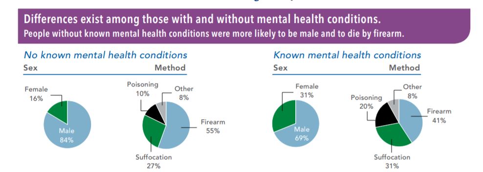 El informe diferencia los suicidas sin trastornos mentales conocidos y con ellos. En el primer caso tenemos que un 84% de los suicidas sin trastornos conocidos eran hombres. En el segundo caso tenemos que un 69% de los suicidas con trastornos mentales conocidos eran hombres. El suicidio es una de las principales causas de muerte en Estados Unidos. En 2016 la tasa de suicidios dobló la de homicidios. Y como vemos, se trata de un problema masculino.